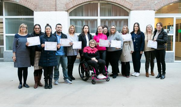 «La finalidad de estos talleres de empleo es doble: por un lado, se forma a personas con dificultades de inserción y, por otro, se asegura que la atención prestada a las personas con discapacidad en centros asistenciales o en su propio domicilio sea de calidad y profesional», ha explicado Pilar Moreno, directora del área social. Junto a ella, la presidenta Marta Valencia se ha encargado de entregar los diplomas.