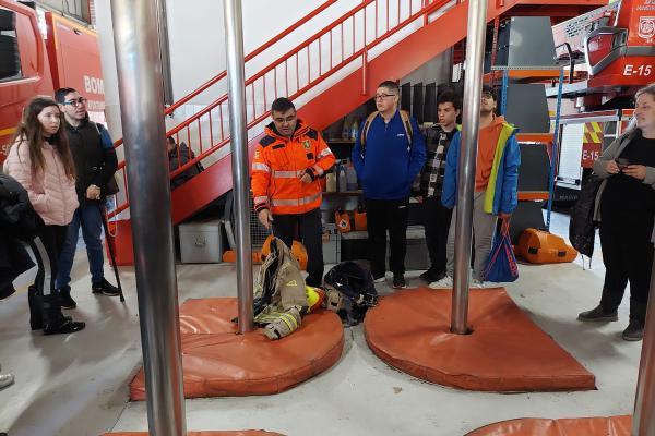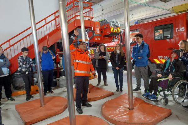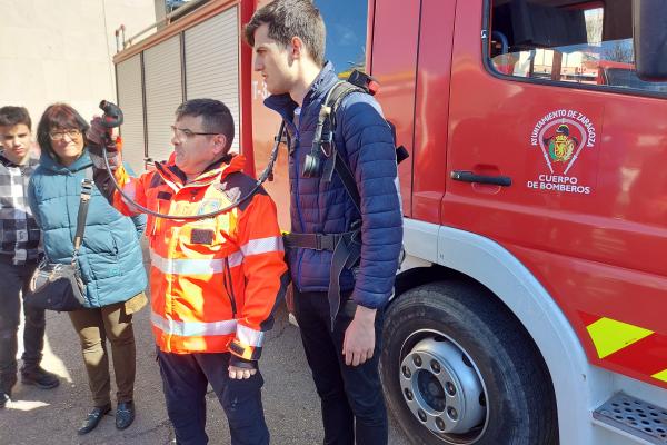 El Parque de Bomberos situado en la avenida Valle de Broto de Zaragoza recibió este miércoles la visita del alumnado de los Programas de Cualificación Inicial de Formación Profesional (PCI). Acompañados por varias de sus profesoras, los chicos y chicas conocieron estas instalaciones municipales y cómo es el día a día de las personas que forman parte de él. Míchel, un bombero a punto de alcanzar la jubilación, ejerció de anfitrión y resolvió las inquietudes que surgían.