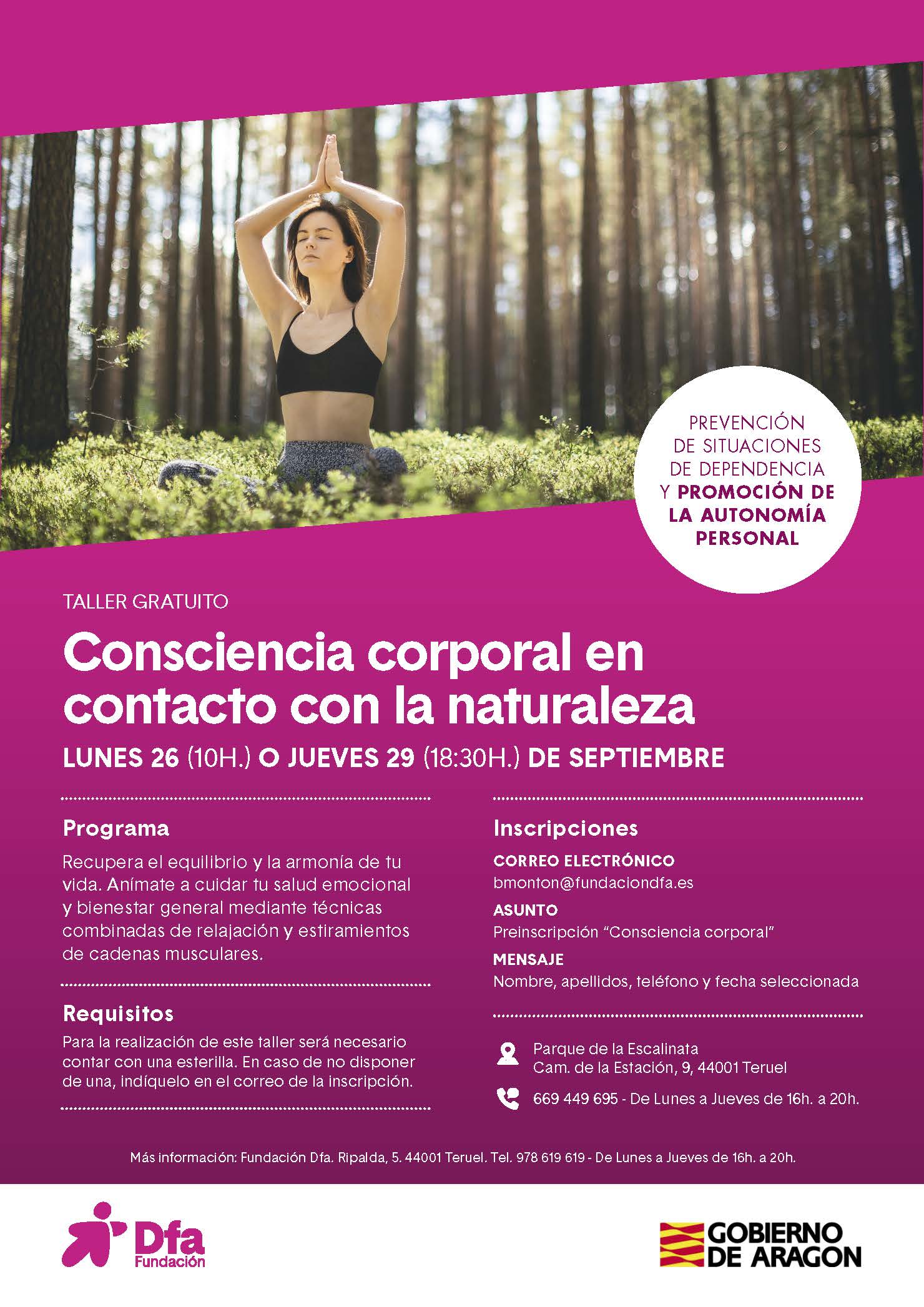 Con la mejora de la salud emocional y el bienestar general, Dfa Teruel trabaja en la organización de un novedoso taller al aire libre bajo el título ‘Clases de consciencia corporal en contacto con la naturaleza’.