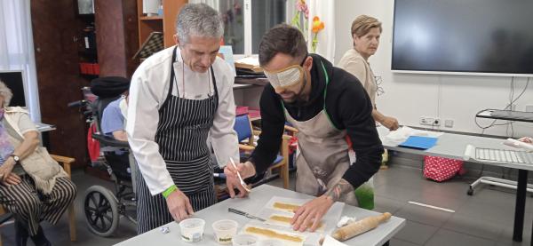 Los propios residentes, acompañados por el pequeño y fiel grupo de voluntariado, aprendieron a cómo desenvolverse en la cocina para elaborar una de las recetas estrella de la repostería de Zapata: la herradura de hojaldre. El tacto, en detrimento de la vista y del oído, es fundamental.