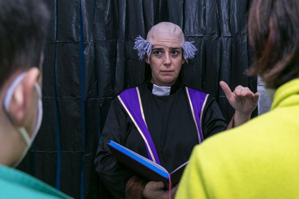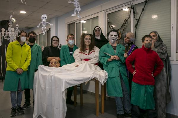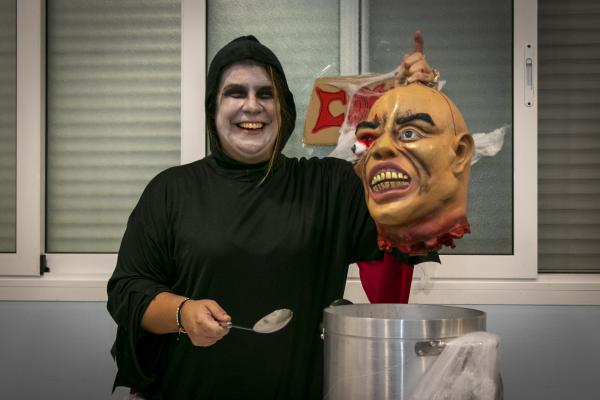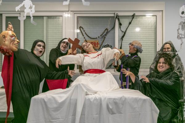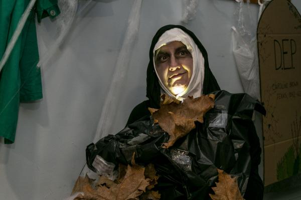 El habitual comedor se transformó en una oscura gruta del horror en el que los usuarios y usuarias del centro ocupacional debían enfrentarse a personajes poco amigables que bien podían ser protagonistas de algunas de las películas más clásicas del cine de terror. Telas de araña, muñecos siniestros, sangre (simulada) y otros elementos de decoración contribuyeron a crear una atmósfera de lo más perversa.