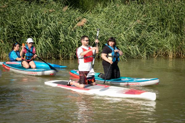 «He visto muchas regatas por televisión y ahora soy yo el que rema; nunca me lo habría imaginado». Quien cuenta su experiencia mientras espera paciente su turno para subirse a una tabla de ‘Stand Up Paddle’ (SUP) -paddle surf en río- es Eduardo, un joven que vive con intensidad la nueva iniciativa deportiva inclusiva sobre las aguas del río Ebro.
