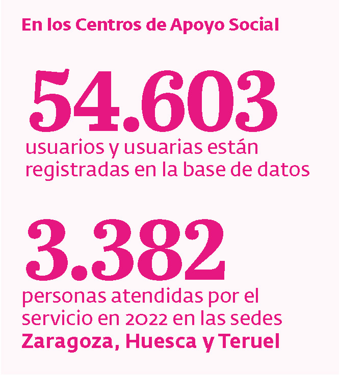 Muchos de los usuarios y usuarias encuentran en el Centro de Apoyo Social la puerta de entrada a la entidad, una primera toma de contacto donde conocen el abanico de posibilidades que ofrece. Ubicados en Zaragoza, Huesca y Teruel, prestan, de manera gratuita, asesoramiento jurídico, médico, de supresión de barreras arquitectónicas y sensibilización ciudadana. Durante 2022, 3.382 menores o adultos se acercaron a alguno de los tres centros, elevando el número de personas con las que se mantiene contacto hasta la cifra de 54.603.
