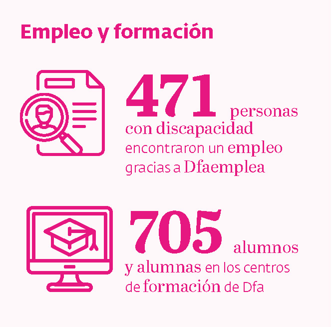 En cuanto a las consultas, la búsqueda de empleo fue una de las cuestiones más solicitadas el año pasado. Con el objetivo de contribuir a la inserción de las personas con discapacidad en el mundo laboral se puso en marcha, en 1985, la agencia de colocación, hoy conocida bajo la denominación Dfaemplea. Desde entonces, alrededor de 10.000 personas han encontrado un puesto de trabajo con la mediación de Fundación Dfa. Solo en 2022, su labor sirvió para que 471 personas abandonasen las listas del paro.