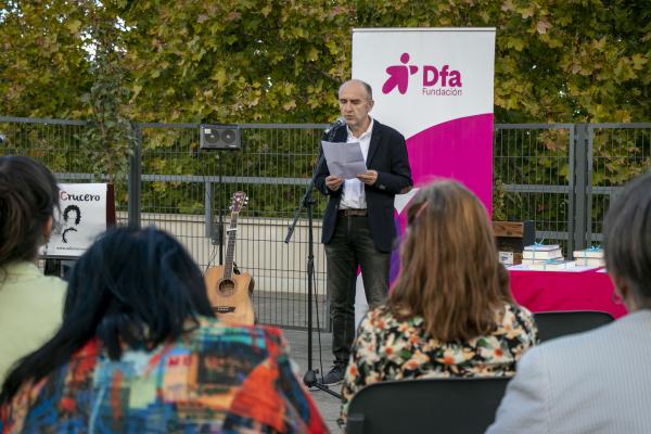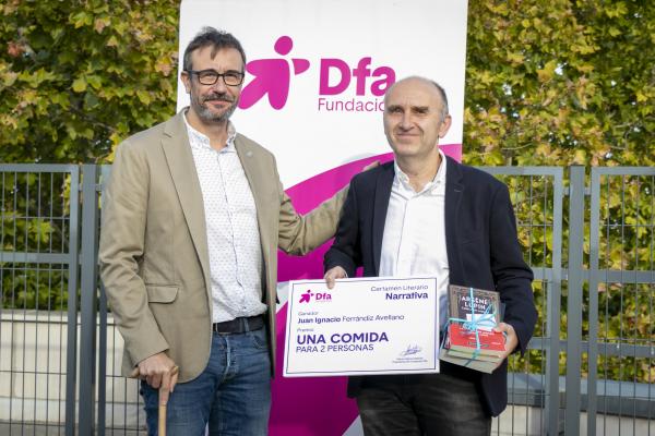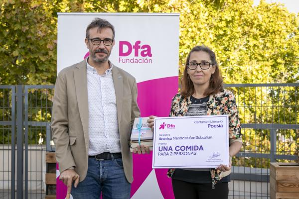 Fundación Dfa hizo entrega este jueves de los premios del XXIX Certamen Literario. Arantxa Mendoza San Sebastián, en categoría de Poesía, y Juan Ignacio Ferrándiz Avellano, en categoría de Narrativa, fueron reconocidos por sus obras ‘Más allá de la vida’ y ‘La noticia falsa’, respectivamente. La ceremonia del concurso organizado por el Centro de Actividades Socioculturales de la entidad se celebró en la azotea del Edificio Josemi Monserrate con la presencia de las personas ganadoras, familiares, personal de Fundación Dfa y la animación del grupo musical Safari o Crucero.