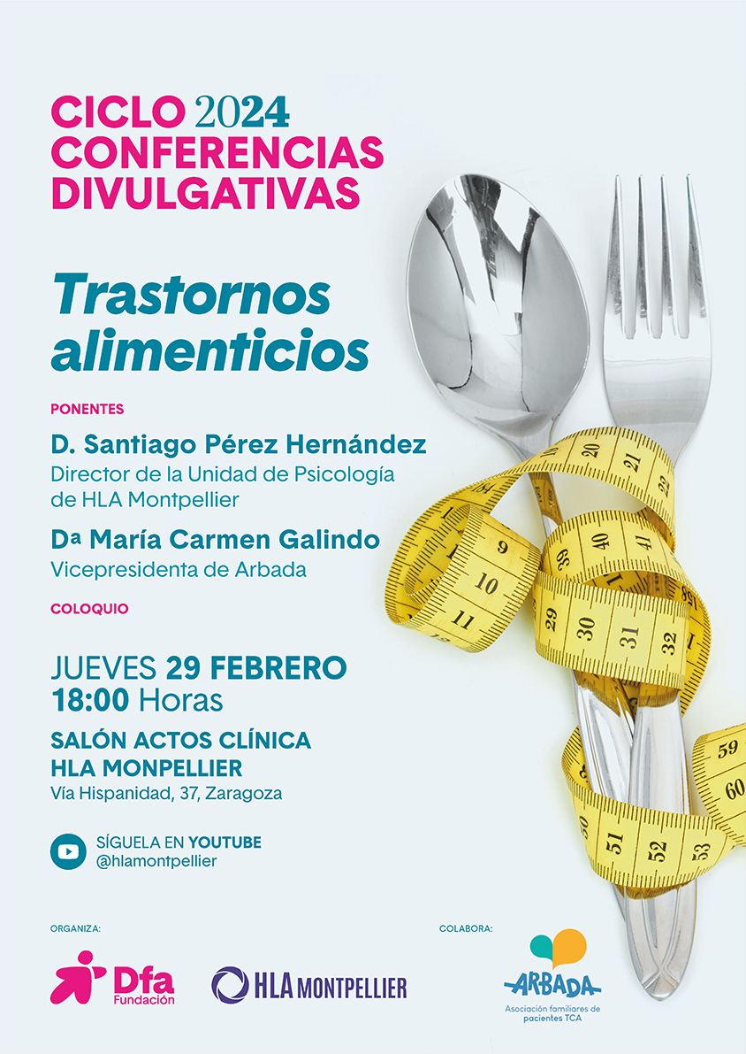 Intervendrán Santiago Pérez, director de la Unidad de Psicología de HLA Montpellier, y Carmen Galindo, vicepresidenta de Arbada, Asociación Aragonesa de Familiares de Pacientes con TCA.