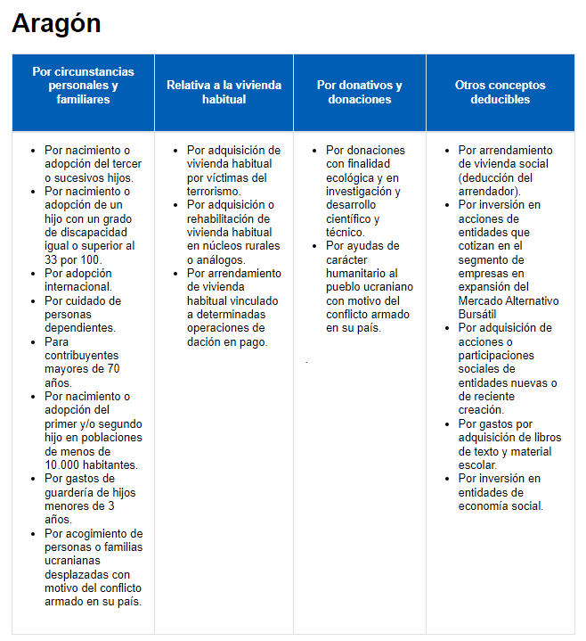 En Aragón se puede aplicar una deducción de 200€ por cada hijo nacido o adoptado con un grado de discapacidad igual o superior al 33% y una deducción de 150€ por el cuidado de personas dependientes (ascendiente mayor de 75 años y ascendiente o descendiente con un grado de discapacidad igual o superior al 65% cualquiera que sea su edad) que convivan con el contribuyente al menos durante la mitad del periodo impositivo.