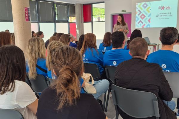 Fundación Dfa celebró una jornada de sensibilización y promoción del trato adecuado hacia las personas con discapacidad, organizada por el Centro de Actividades Socioculturales. La iniciativa tuvo lugar en el edificio Josemi Monserrate y contó con la participación de una veintena de personas voluntarias de Z Zurich Foundation, así como alumnado de los Programas de Cualificación Inicial de la entidad.