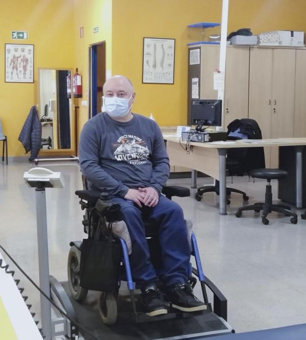Uno de los usuarios habituales de la báscula adaptada en el servicio de rehabilitación de Pomarón es Gregorio Lizalde, usuario de la propia residencia, quien no falla a su cita mensual para controlar el peso desde hace más de 20 años. «Sabiendo lo difícil que es acceder a este servicio en Zaragoza, es una suerte para mí poder pesarme aquí, porque no tengo casi ni que desplazarme», explica Lizalde desde su silla.