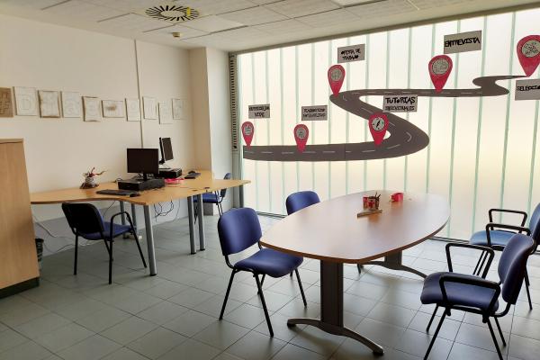 Los chicos y chicas que cursan los itinerarios profesionales de auxiliar de servicios administrativos y de auxiliar de arreglos y adaptaciones de artículos textiles plasman en esta sala los proyectos a los que durante muchos meses dedicaron sus esfuerzos. Un mensaje integrador a través de diferentes dibujos de personas adorna la cristalera de una sala en cuyas paredes se muestran una sopa de letras gigante con términos utilizados en el proceso de búsqueda de empleo o un itinerario que parte en la confección del currículum vitae y finaliza la selección de una oferta laboral.