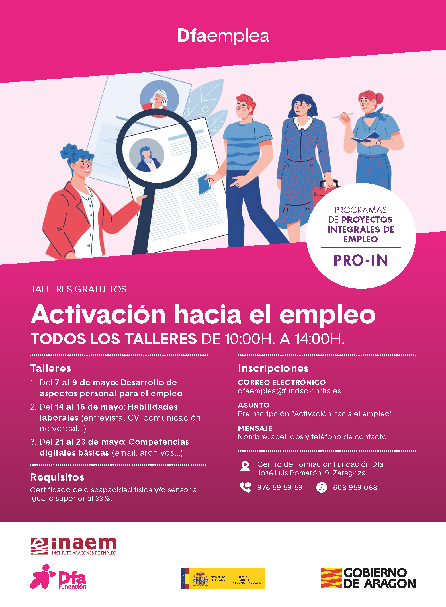 Fundación Dfa organiza este mes de mayo el ciclo 'Activación hacia el empleo'. A lo largo de tres talleres gratuitos dirigidos a personas con certificados de discapacidad física y/o sensorial igual o superior al 33%, los participantes conocerán diferentes estrategias y herramientas que les servirán de ayuda y orientación a la hora de mejorar su empleabilidad.